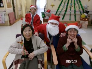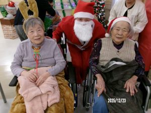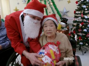 当日は、皆様のもとへサンタクロースが登場!お一人おひとりに心を込めてプレゼント🎁をお渡ししました。皆さま、突然のサンタの訪問に驚きつつも、「ありがとう!」と中身を楽しみそうに確認される皆様の姿に私たちも嬉しくなりました。😍