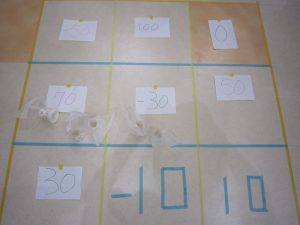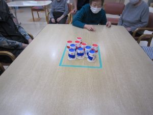 こちらは、紙コップ陣取り合戦‼青と赤チームで競います💪