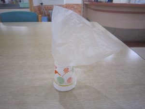 紙コップの底を切り取り、ビニール袋を通したもの✂️考えますね~