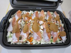 まずは・・・野菜やメインの鮭を投入‼️そして味噌投入‼️