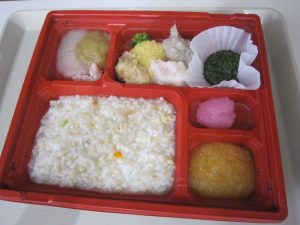 まずは、常食(普通のお弁当)。写真はないですが、主食がおにぎりでの対応の方もいるのですが、その場合は、筍ごはんが入ってる所がおにぎりになります🍙