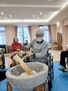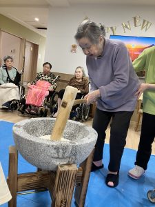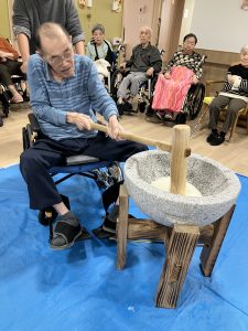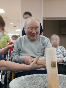 新年あけましておめでとうございます。本年もよろしくお願い致します。令和8年最初の行事は、コスモス苑入居全体行事として餅つき行事を企画しました。午前は新館側の入居者様、午後からは本館の入居者様ほとんどの方が参加され楽しまれていました。