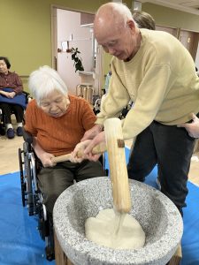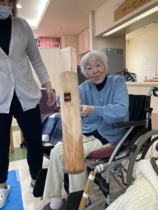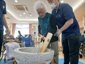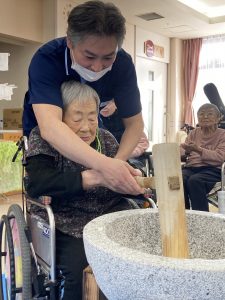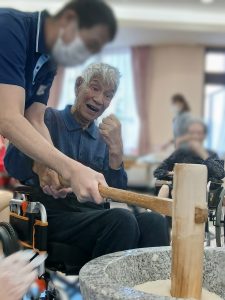 普段落ち着かれている方が臼と杵を見て車椅子から立ち上がり「ヨシ!やるか!!」と覚醒される方もΣ(・□・;)入居者様が杵で餅を打つ際「ヨイショ!ヨイショ!!」と餅を打つごとに回りの入居者様から歓声が上がっていました。職員が打つ際は「ダメダメ!貸してごらん、腰に力が入ってない!!」とお叱りのお言葉を頂く場面も(苦笑)